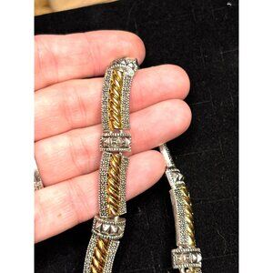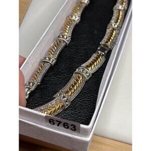 This vintage necklace features a mesmerizing two-tone design, combining sterling silver with gold-plated accents. Its intricate detailing and classic elegance bring a timeless charm, reminiscent of the sophisticated jewelry styles of the past. Ideal for collectors and those who appreciate the artistry of vintage craftsmanship, it makes an elegant adornment for a refined look.