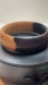 Stylish two-tone wooden bangle bracelet. Features a blend of natural wood and dark tones.