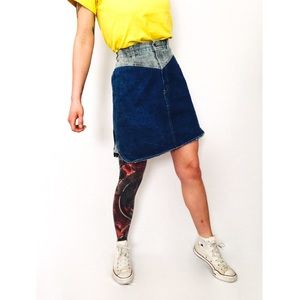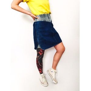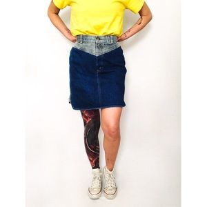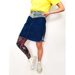 Vintage two-tone stonewashed denim skirt in grey and medium blue hues. Features contrast detail at yoke, above-knee-length, and A-line silhouette. Contrast panels at sides, rounded hem. Button and zipper closure at front, loops for optional belt wear.