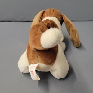 Tracker the basset hound is light brown and white with extra soft plush, floppy ears, and stitched nose. Eyes are intact and glossy. Includes both the original heart-shaped swing tag (with Tracker's poem and date of birth: June 5, 1997) and tush tag identifying "The Beanie Babies Collection" and "Tracker." 1996 Ty Inc., made in China, surface washable, polyester fiber & P.E. pellets.