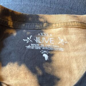 Vintage U2 2010 360 Degrees concert tour shout sleeve unisex t shirt. Features crewneck, short sleeves, graphic on center front and list of tour locations on the back. All over black & camel tie dye print.