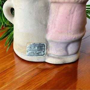 Charming vintage ceramic figurine bud vase by UCTCI Japan, likely from the 1970s, featuring one of their signature “Poppet” girls. This sweet figure wears a large pink bonnet and stands beside a jug-style vase. Made of matte ceramic in soft pastel tones of pink, beige, and lavender.