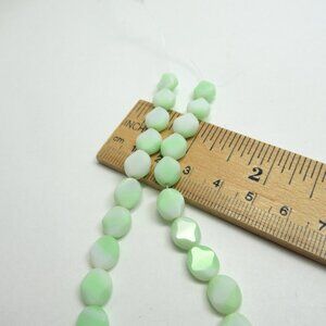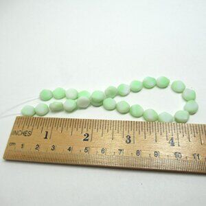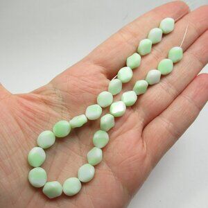 This listing is for the strand of 25 table cut Czech Uranium glass beads pictured. They have never been used, are vintage stock and come temporarily strung on monofilament. These beads are a beautiful mix of white and pale green colors and parts of them glow brightly under blacklight. The beads glow under blacklight because of the Uranium used in making and coloring the glass.