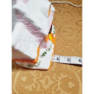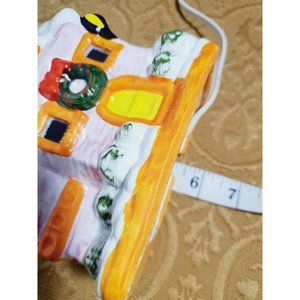 Charming vintage holiday house decor. Features snow-covered roof. Bright orange door and accents. Green wreath adds festive touch.