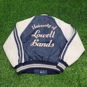 Rare 80s UMass Lowell Band varsity jacket with satin finish and bold collegiate script on back USA made