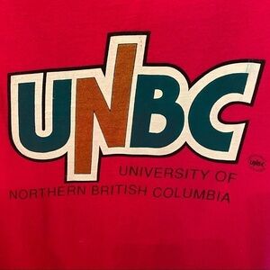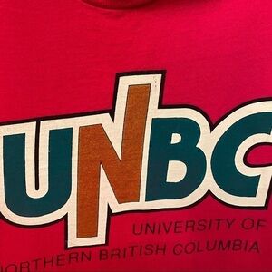 Pre-owned in great condition with no rips. Nice pink vintage University of Northern British Columbia t-shirt. There’s some green marks on the letter ‘C’ as shown in picture. Single stitch sleeves and hem. Made in USA. Comes from smoke and pet free home.
