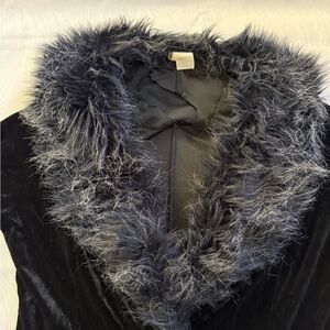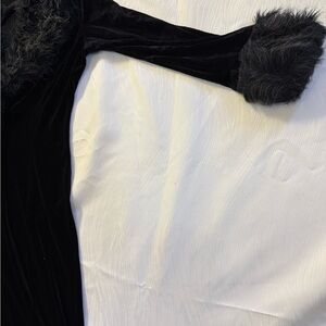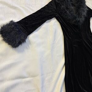 Dramatic Vtg UNE black velvet duster coat/dress with faux fur trim. This sweeping piece channels Old Hollywood glam with a gothic edge — perfect for cosplay, statement styling, or gothic winter layering.