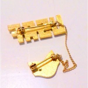 Adding to its elegance, the pin is adorned with half pearls, providing a classic and timeless appeal. Each half pearl is meticulously placed, creating a sense of refinement and sophistication. However, a subtle touch of authenticity comes in the form of a missing half pearl on the end of the letter 'F.' This slight imperfection tells a story, suggesting that this pin has weathered the passage of time, yet still retains its unique charm.