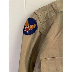 Classic WWII era khaki cotton button up shirt featuring authentic embroidered US Army Air Forces patch on upper left sleeve.