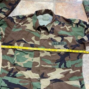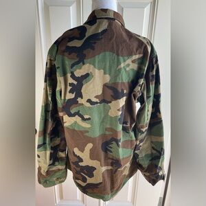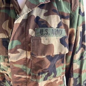 Vintage US Army camouflage military jacket perfect for outdoor adventures. Durable and comfortable design.