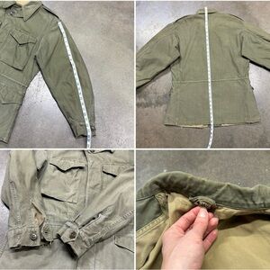 Vintage U.S. Army field jacket, believed to be M-1951 (M-51) model in OG-107 olive green. Tagged size 34R. Features epaulets, four front pockets, adjustable waist, and button front.