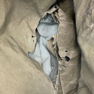 Has some rips in the lining (lining is actually green but the close up photos of the rips look tan). The lapel pin is missing one backing - no other flaws noticed. Has been washed and is ready to be worn. See photos.