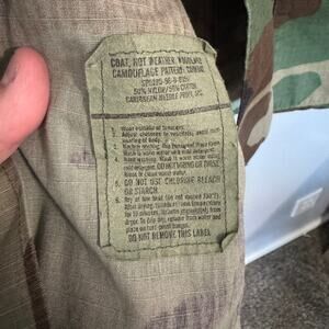 Vintage U.S. Army Woodland Camo BDU Combat Jacket in men's Size Large Regular. Has some patches, including an Airborne one. Military, nylon & cotton blend. Jacket is in good used condition with no flaws or stains other than some minor wash wear. Please see close-up pictures for condition details.