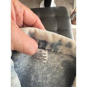 Very good preowned condition with a small spot on the upper left chest area that is barely noticeable, this is a U. S. Blues denim jacket with brass buttons down the front and on the patch pockets. Side pockets also. Adjustable straps in the back. The back of this jacket is amazing as it is embroidered with a beautiful green and red dragon who also has a metallic gold underbelly. The jacket states “New York City-Los Angeles.” This is also embroidered. Measurements are approximate and are taken flat.