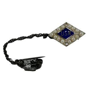 Vintage US Navy Pin Tie Tack Lapel Pin USN Chain Stamped Sterling w Faux Pearls