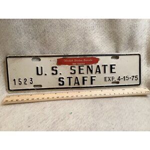This vintage U.S. Senate staff license plate from the 99th Congress is a unique collector's item. Displaying the expiration date of April 15, 1975, it offers a glimpse into a historical period of American politics. A notable piece for enthusiasts of political memorabilia or vintage automotive accessories.