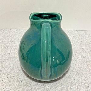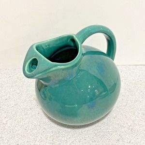 Vintage USA Art Pottery Tilted Ball Pitcher w/ Ice Lip Green Glazed 1950's Mod