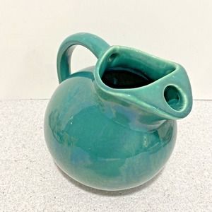 Vintage USA Art Pottery Tilted Ball Pitcher with Ice Lip - retro Green Glazed finish - classic 1950's Mod look. There is a small chip on the underside of the spout (see pic) - otherwise this jug is in excellent vintage condition and ready to use or display.