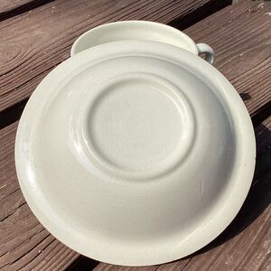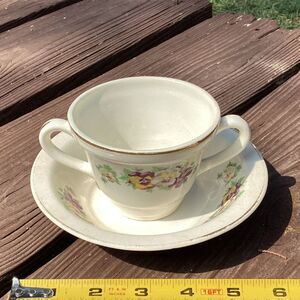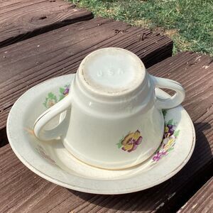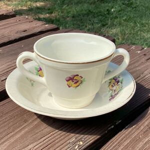 Keywords: soup bowl, saucer, vintage, floral, pansy, cream, gold trim, USA made, handled bowl, dishware, table setting, collectible, antique, ceramic