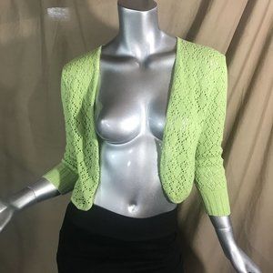 Vintage USA Notations Women's Medium Crop Neon Green Crochet Knit Open Front Cardigan Top. 3/4 Sleeve Lightweight Sweater.