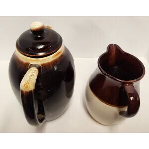 Lot of 2 vintage American pottery pitchers including a Hallcraft lidded pitcher (HD703) and an R.R.P. Co. #121-J pitcher from Roseville, Ohio. Both feature brown and cream drip glaze. Light vintage wear consistent with age. Hallcraft base has green felt pads; both are clearly marked.