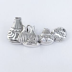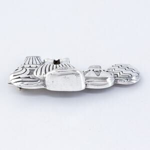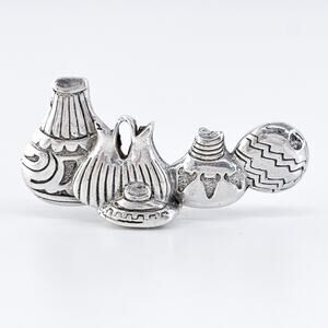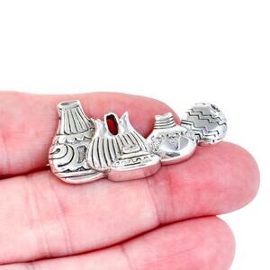 This vintage brooch showcases a beautifully detailed row of traditional Southwestern pottery in high-relief sterling silver. Designed by STC, it evokes the artistry and heritage of Native American-inspired craftsmanship. A unique statement piece perfect for collectors or adding rustic charm to jackets, shawls, or hats.