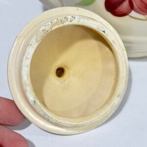 Vintage USA Teapot by Shawnee done in creamy natural white ceramic with a hand painted floral design on front and back. Textured finish on the lid - clearly hallmarked USA on the base. This is a charming 3-cup size perfect to display but very usable too. In overall good vintage condition - minor stains around the rim (see pics) and obvious shelf wear on the base but no significant damage such as cracks or chips.