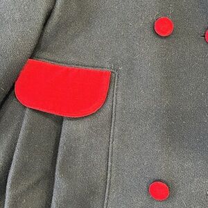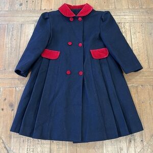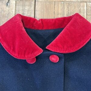 Vintage USA navy wool pleated velvet trim button front long pea coat and hat