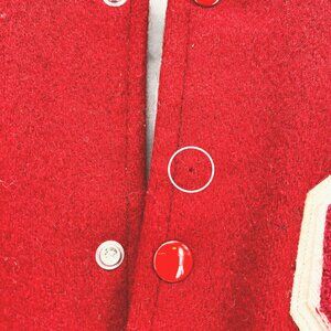 Red and cream letterman jacket made by Neff. Unsure of the exact decade. No materials tag but feels like wool and leather. Size large