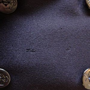 Pre owned and in good condition. All buttons accounted for. Has multiple spots where moths likely got at the coat. Photos show areas where moths have eaten "divots" in the fabric surface. There is on such on the very front in between the button (photographed) Fortunately, the remainder of these areas are either on the inside sleeves or armpits or, in the case of the lapels, hidden when the coat is buttoned up. These divots are really only noticeable in full sun. Priced accordingly.
