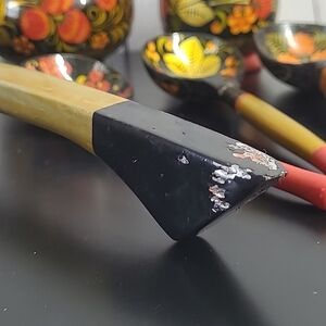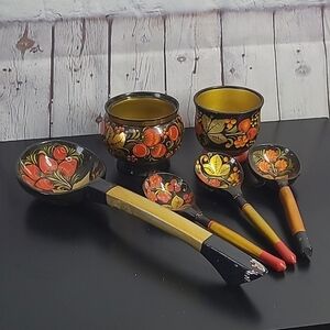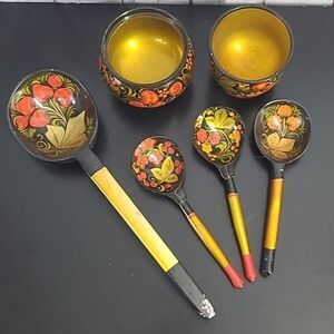 Vintage USSR Hand Made in Russia Floral Berry Gold Black Wood Spoon & Bowl Set of 6