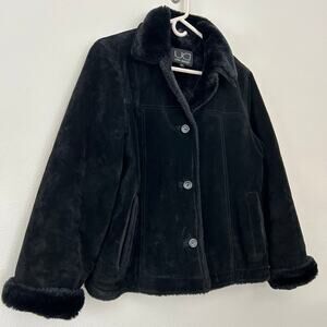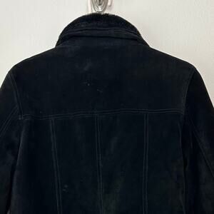 UTEX Design Women's jacket Suede Faux suede black Faux fur collar Faux fur cuffs Vintage 90s Y2K boho bohemian hippie goth gothic grunge outdoor western cowgirl retro leather Short trucker style Button front Lined Winter coat
