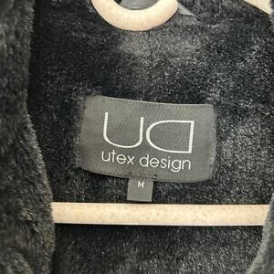 Vintage women's black suede jacket by UTEX Design jacket. The jacket features a soft, faux fur collar and cuffs, adding a touch of cozy elegance. It has a classic button-up front and two front pockets. This piece is perfect for a chic, retro look. A timeless addition to any wardrobe.