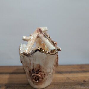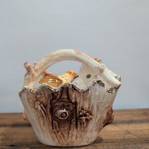Vintage Ucagco Ceramics Bird on Tree Trunk Basket Figurine 5"