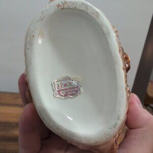 This vintage Ucagco Ceramics figurine features a bird sitting on a tree trunk basket, made of ceramic with a glossy finish. Originating from Japan, this multicolor piece stands at 5 inches tall and showcases intricate details of a bird theme. The original production technique used for this vintage figurine is pottery, making it a unique and charming addition to any decorative pottery and glassware collection.