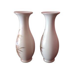 Pre-owned vintage Ucago Japanese vases. Hand painted gold bamboo and white crane type birds. Gold colored trim. Cream colored base.Light weight China type composition.