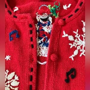Red ugly Christmas sweater cardigan with festive snowmen and Santa. This beauty is loaded with crafty embroidery and snowflakes. There's even a little snowman on the back. Button front. Cheesy xmas party jumper.