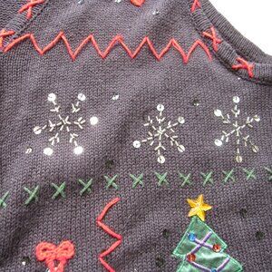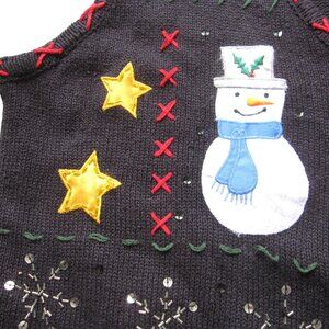 Vintage Ugly Christmas Vest Womens Size 1X Black Cotton Blend • Snowman Sequins