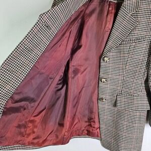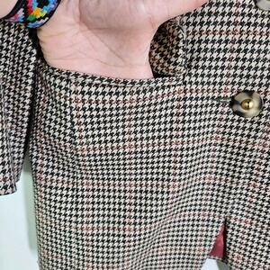 Key features: tan/black houndstooth plaid with a touch of dark red, flap pockets, satin lining, unique buttons