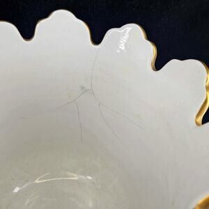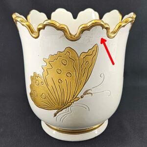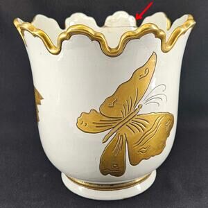 Vintage Ugo Zaccagnini Italian Pottery White Gold butterfly Cache Pot planter. Measures about 7" T, 7.25" D. In great vintage condition but has a repair on edge. There is also some crazing on the inside.