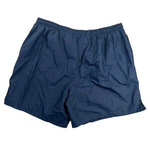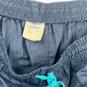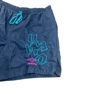 The Vintage Umbro Men's Shorts in dark blue/light blue, size Large, are a stylish and comfortable choice for athletic activities. Made from nylon fabric with a solid pattern, these shorts feature a drawstring closure and an elastic waist for a personalized fit. With a vintage design and sports theme, these shorts are perfect for soccer and other active occasions.