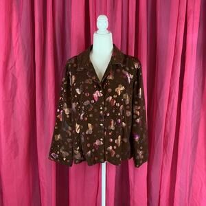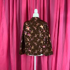 Chocolate brown blouse with hologram style butterflies and polka dots. Shirt has 3/4 length sleeves and gold buttons. Notched V collar, double side slits, and darts in waist. Not much for stretch. #fairycore