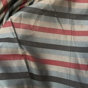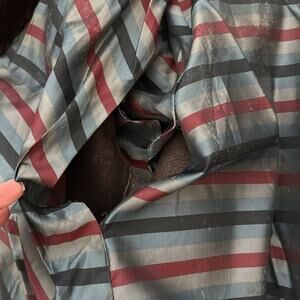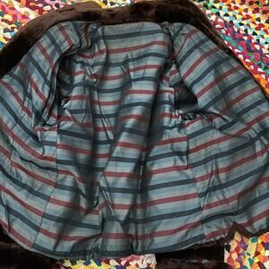 Chocolate brown. Open front - has two hooks but no closure on the opposite side. Has pockets. No size or material tags - see measurements for fit. Lined - lining is spotted and torn on inside right arm - see photo. In otherwise fine vintage condition - no rips or stains to outer surface. Flat lay measurements are approximate.