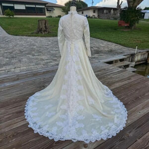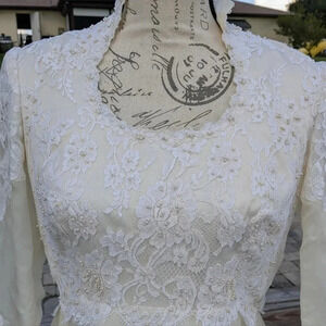 Pre-owned and may show signs of wear and tear from previous owners. Pictures may seem different in person. See photos for details Charming Vintage Lace Wedding Dress Step back in time with this charming vintage wedding dress from the 1960s-1970s. This gown features a high lace neckline, long sleeves, and intricate lace detailing throughout. Delicate lace and flowing skirt add a touch of nostalgia and grace to your special day.