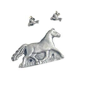 This enchanting vintage set, crafted from pewter, embodies a timeless elegance with its detailed horse motif. The brooch and earrings are versatile accessories, perfect to add a touch of sophistication to any ensemble. The pewter material ensures durability, while the intricate design showcases a love for equestrian themes.