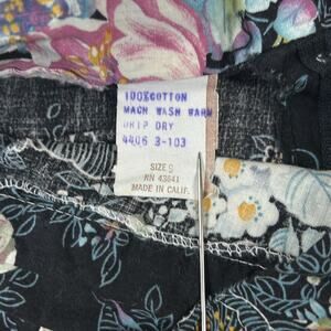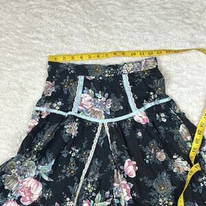 Vintage unbranded floral print midi skirt, size small. Boho prairie skirt made in the USA of 100% cotton. Features an a-line silhouette in a midi length with ribbon and lace accents and back zip closure. Black, with floral print in white, pink, blue, purple, green, and orange. No stretch and vintage runs small, so please double check your measurements!