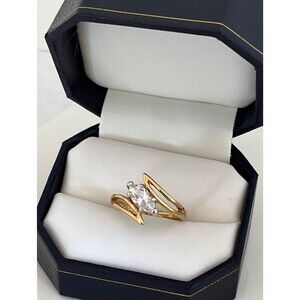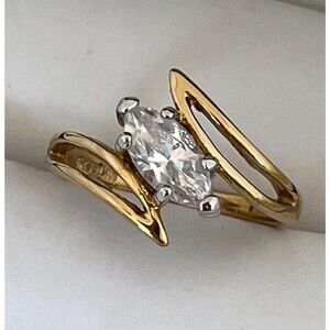 Gorgeous 14KT gold plated ring featuring a prong set marquis cut cubic zirconia. The band is plated in yellow gold and the tips of the prongs are plated in white gold.