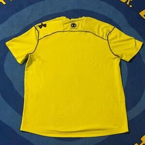 ☆ Features: Bright neon yellow performance fabric with HeatGear tech, black contrast stitching, “COMBINE” front text, Under Armour logos on front and back shoulders, and interior camo pattern lining at the neck.