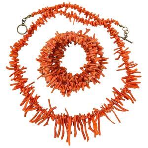 Vintage Undyed Mediterranean Red Coral Spiky Branch Necklace Wrap Bracelet Set