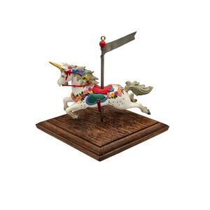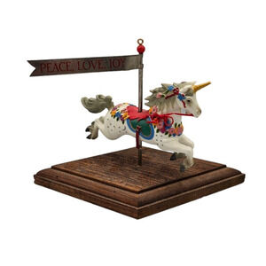 This beautiful vintage unicorn carousel horse figurine is a true work of art. Hand-painted with intricate details, this figurine is sure to bring peace, love, and joy to any collector. The unicorn is depicted on a wooden base and is an original piece, not a reproduction. The fantasy genre is well-represented with this unique collectible, which is perfect for anyone who loves unicorns or mythical and magical items. The piece is not personalized and is not handmade. This is a must-have for any unicorn lover's collection.